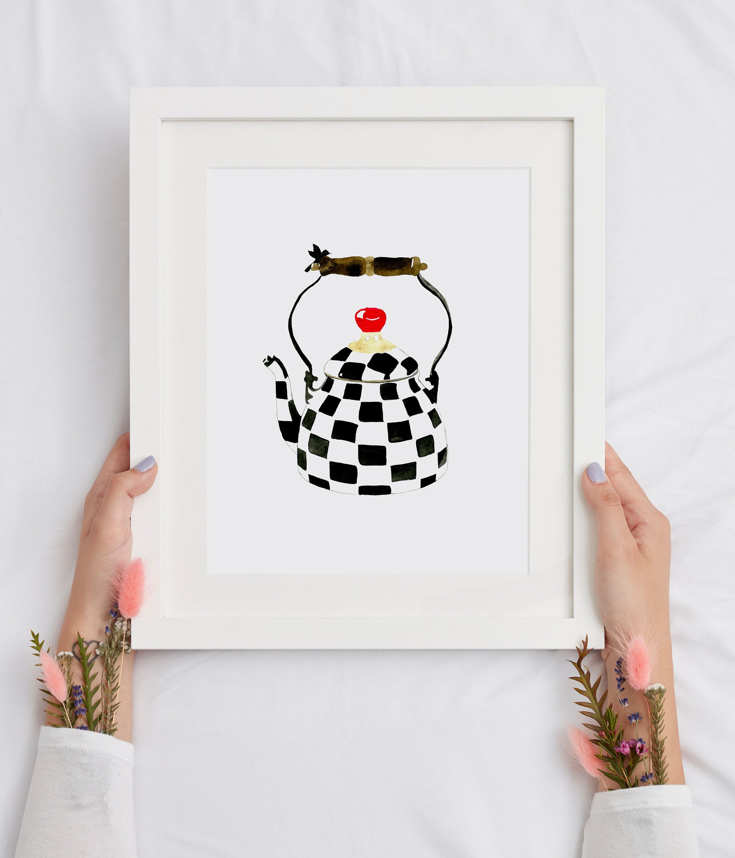 Watercolor Teapot Print Art, Checkered print, Kitchen decor, black and white teapot, Vintage Kettle Watercolor Print