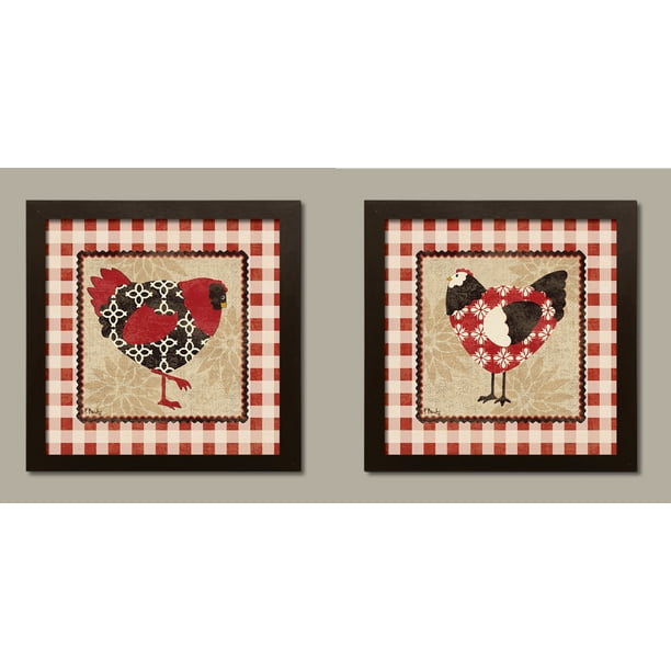 2 Barnyard Red and Black Chicken and Rooster; Kitchen Decor, Two 12x12in Brown Framed Prints; Ready to hang! Red/Cream/Brown