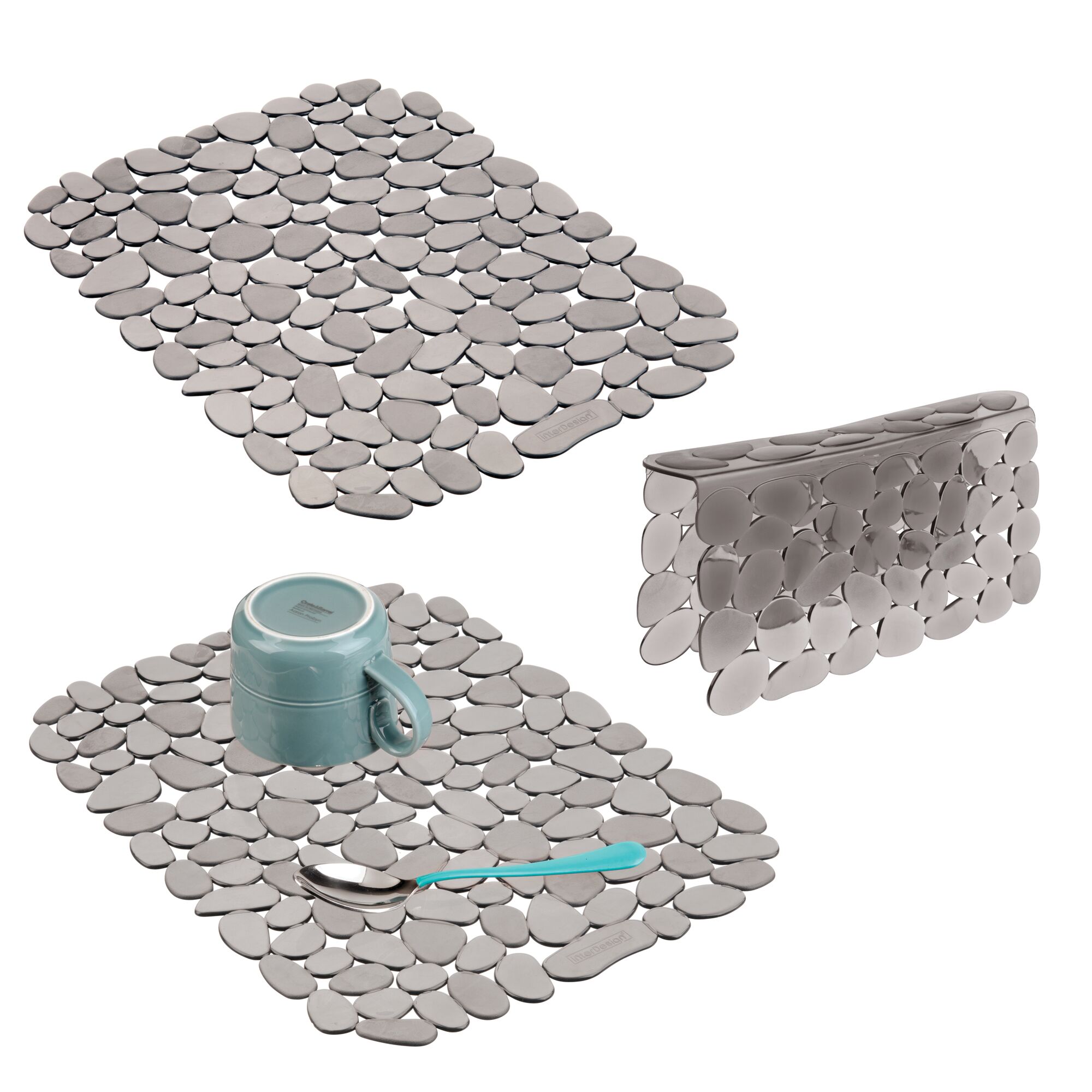 The mats are made of clear rubber with small squares and holes to allow drainage. The material naturally resists water and is flexible to soften impacts. Our kitchen sink pad set includes two standard-size mats (13" long x 9 1/2" wide each) plus a saddle mat (11 1/2" long x 9 3/8" wide) that goes over the divider and runs down the sides. After hours of researching and using all the models on the market, we find the best kitchen sink divider mats of 2021. Check out our ranking below! Sale RANKING No. 1. iDesign 36700 Euro Plastic Sink Saddle, Glassware and Sink Protector for Kitchen, Bathroom Pots, Pans, Dishes, 11" x 12", Clear. 1. 2Pcs Sink Mat Adjustable Kitchen Sink Saddle Eco-friendly Sink Protector PVC Material Modern Pebble Design Cushions Sinks Dish Drying Mat for Kitchen Accessory 12″ x15.8″ (Grey) Buy on Amazon This sink saddle is made of Polyvinyl chloride (PVC), soft material, safe and non-toxic, it keeps your kitchen sinks clean and scratch free ...