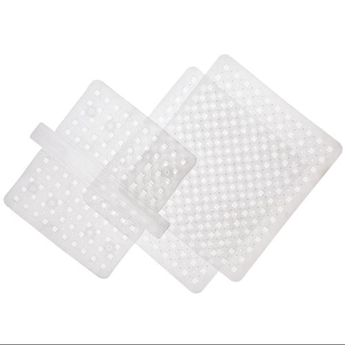 SCRATCH FREE SINKS: 1 Sink saddle and 2 Sink mats will keep your Double kitchen sinks clean and scratch free. It will protect your glassware and fine crystals. SIZE- Each Rubber sink mat measures 11" x 12.5"; Sink saddle measures 11" x 12" Clear plastic with Suction cups 3 Peice Drain stopper is a bonus with this Kitchen Sink Protector Mat Pad Set