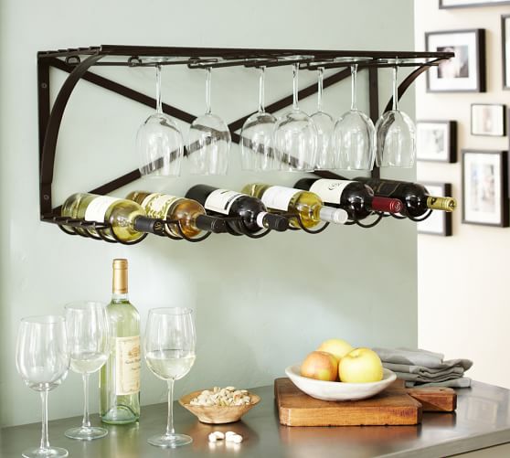 Pottery barn aluminum silver tone wine rack holds 6 bottles of wine. Wine glass shelf backed with keyholes for mounting; 1 shelf the one in the middle of photo that holds glasses. Pottery barn wine bottle wood black shelf rack. Bottle shelf holds 6 wine bottles. Source: www.kool-air.com. Wine glass holder holds a total of 10 wine glasses, each ...