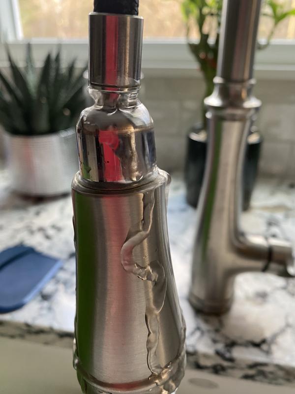 Faucet is leaking or dripping from the handle. This troubleshooting document relates to standard, pull-out, and pull-down kitchen faucets. Description of the leak: With this leak, water will leak from the area where the handle attaches to the faucet body after the water has been turned off or while the faucet is still on. Causes of the Leak