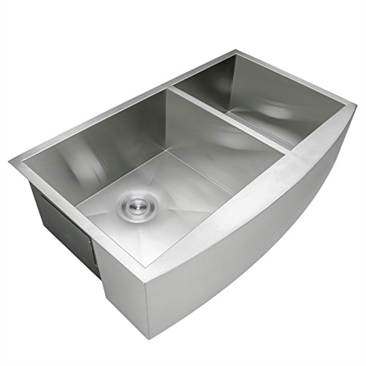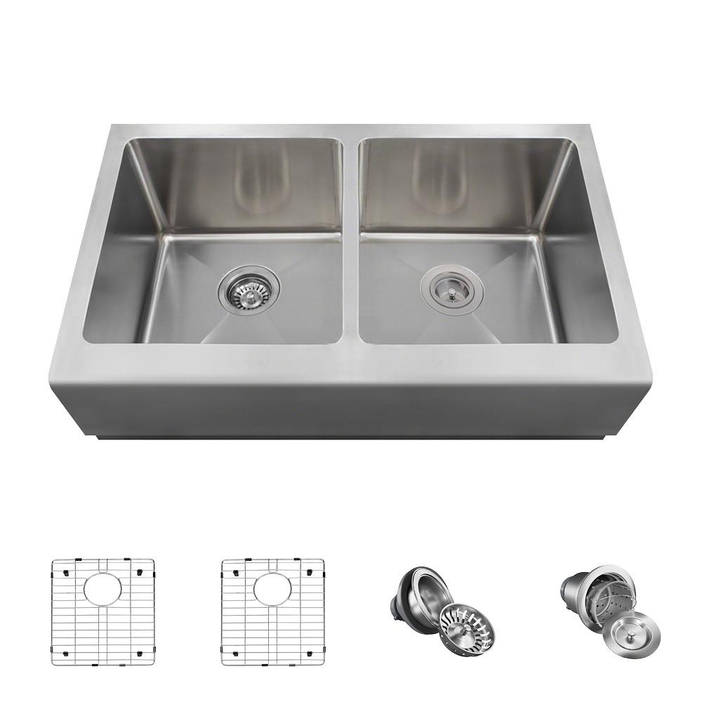 Tuscany® Farmhouse/Apron Front 30" Stainless Steel Double ... - Menards This 30" x 21" x 10" under-mount 50/50 double bowl curved apron front farm sink is both stylish and durable. It is made of 16 gauge premium T-304 stainless steel featuring R15 radius corners for easy cleaning and has two 3-1/2" drain openings. The sink is handmade with a latex coating sprayed underneath plus heavy duty pads to help absorb and deaden sounds. This sink included two stainless ...
