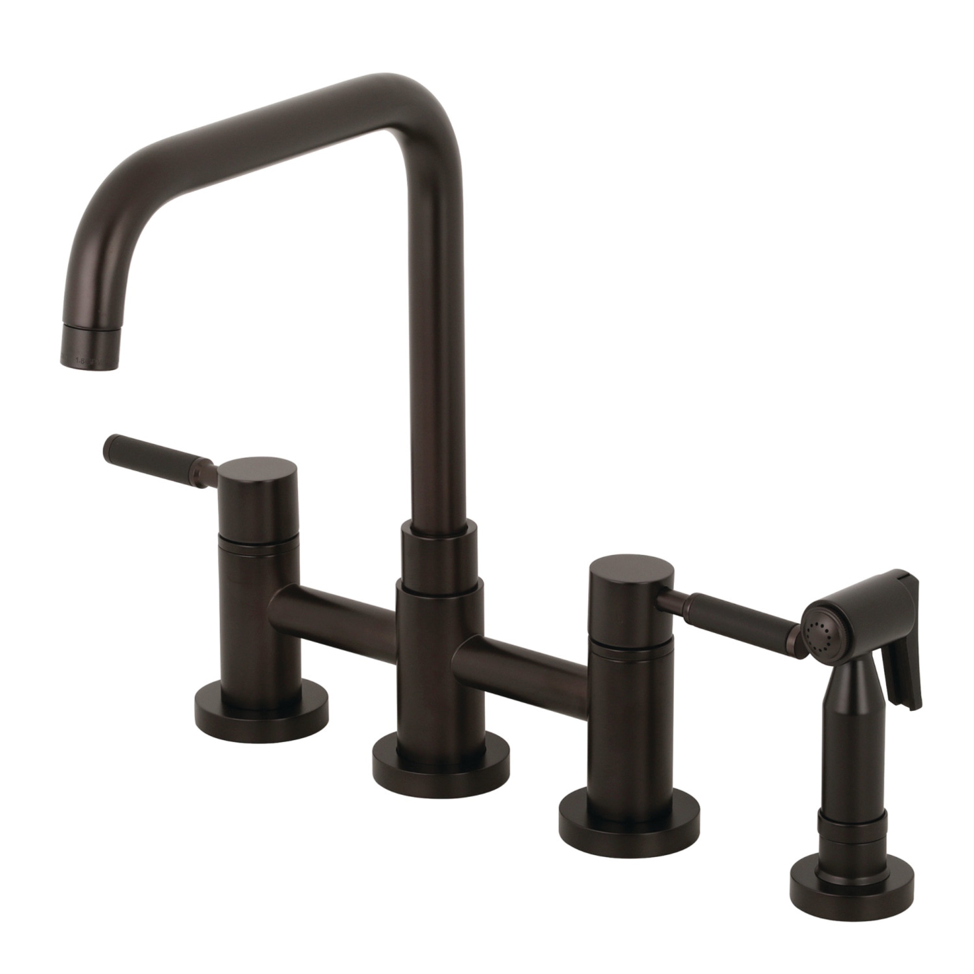 Drain Options for Your Bridge Bathroom Faucet | KingstonBrass.com Bridge faucets are most commonly built for 8" widespread hole- drillings. Many pre-drill sinks/counters include 3 drilled holes for 8" widespread faucets that utilize the middle hole. If your bridge faucet results in an exposed middle hole, Kingston offers color-matching sink hole covers. SKU: SC1005 Kingston Brass Restoration Two-Handle Oil-Rubbed Bronze Kitchen Faucet ... Classical artistry from the late 19th Century to early 20th Century is mirrored beautifully within this faucet's traditional charm. Whether you are striving for a Victorian-inspired kitchen or a vibrant 1950s-themed space, the unique bridge design is a highly favored option amongst those doing period-style kitchens. Because of its added architectural elements and detailing, the oil rubbed ... Why Is the Bridge Faucet and Farmhouse Sink a Great Kitchen Duo? The bridge faucet is acclaimed for its unique architecture that which features a two-hole hot and cold intake with a center bridge that connects the inlets with the faucet spout. Its eye-catching build contrasts the traditional faucet in which the hot and cold lines come together at either the base of the faucet or underneath the countertop.
