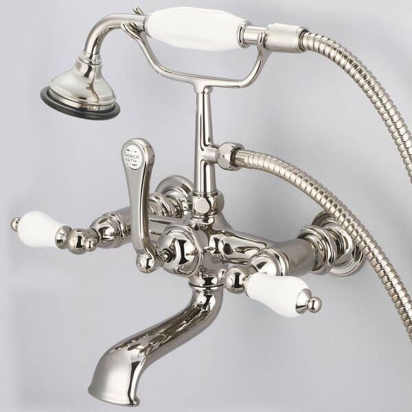 3-Handle Vintage Claw Foot Tub Faucet with Hand Shower and Porcelain Lever Handles in Polished Nickel PVD