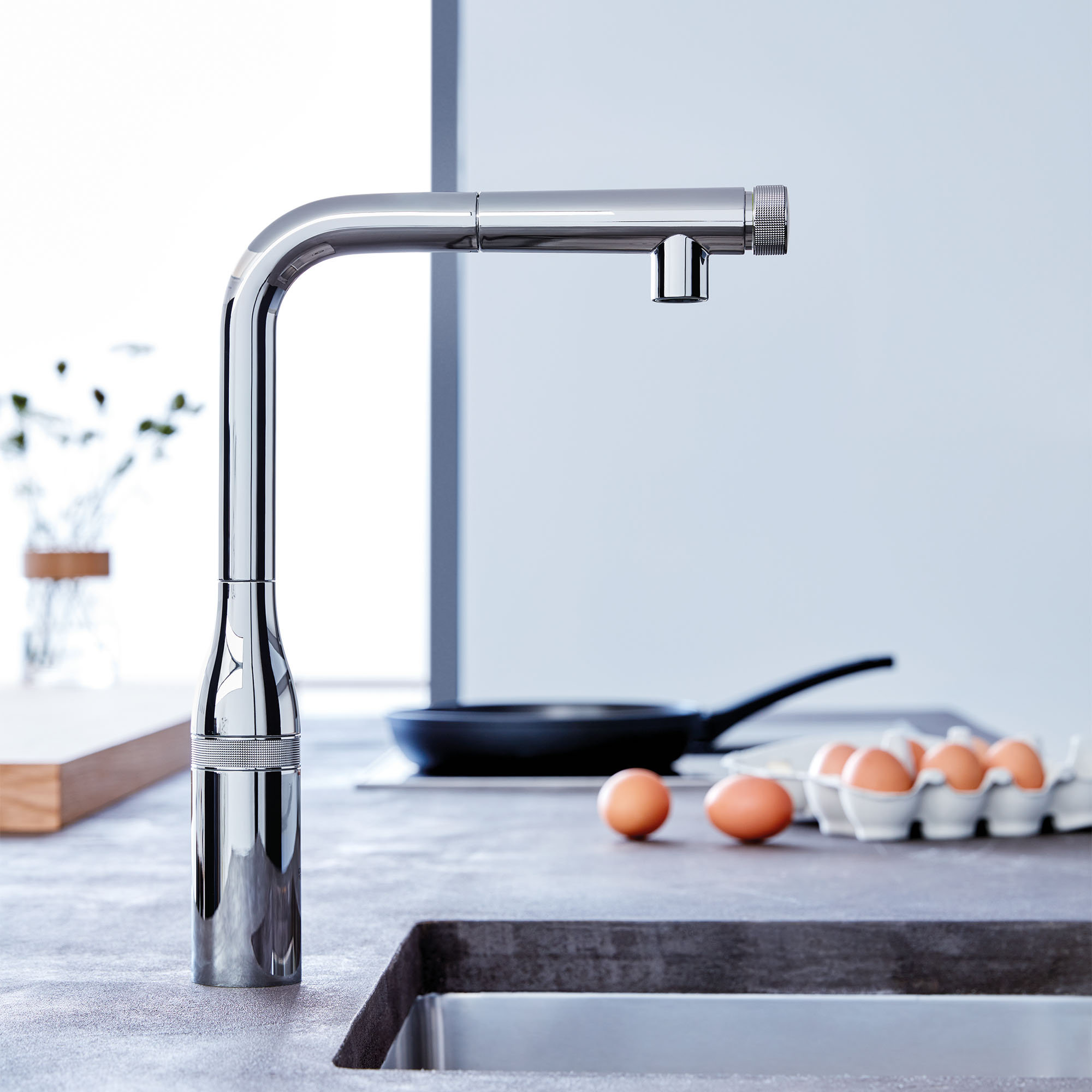 Essence Collection - GROHE Clean lines and cylindrical modern design make the NEW GROHE Essence the natural choice for today's cosmopolitan kitchen. The extended comfort spout height embodies minimalist beauty in its purist form, while the pull-out dual spray with toggle function allows for seamless switching between spray and regular water flow.