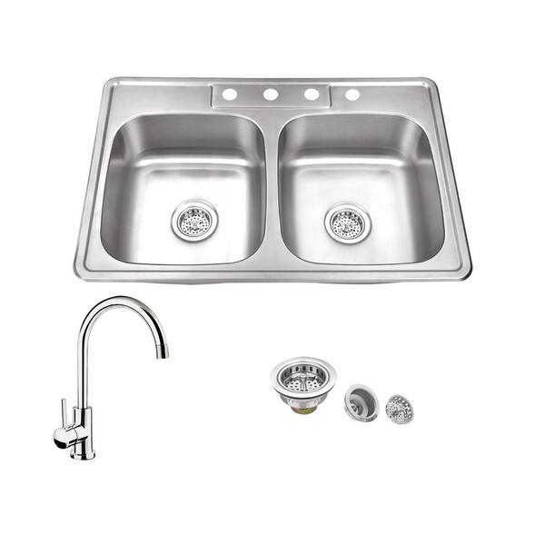 All-In-One Drop In 20-Gauge Stainless Steel 33 in. 4-Hole 50/50 Double Bowl Kitchen Sink with Gooseneck Kitchen Faucet