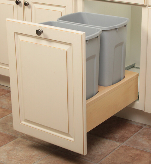 Double Trash Can Pull-out - Kemper Cabinetry To ensure highest satisfaction we suggest you view an actual sample from your dealer for best color, wood grain, and finish representation. See your designer for details. Description Make life simpler with two trash cans stowed away neatly in one cabinet. See It In Action Double Trash Can Pull-out Where to buy: Ready to make your kitchen your own?