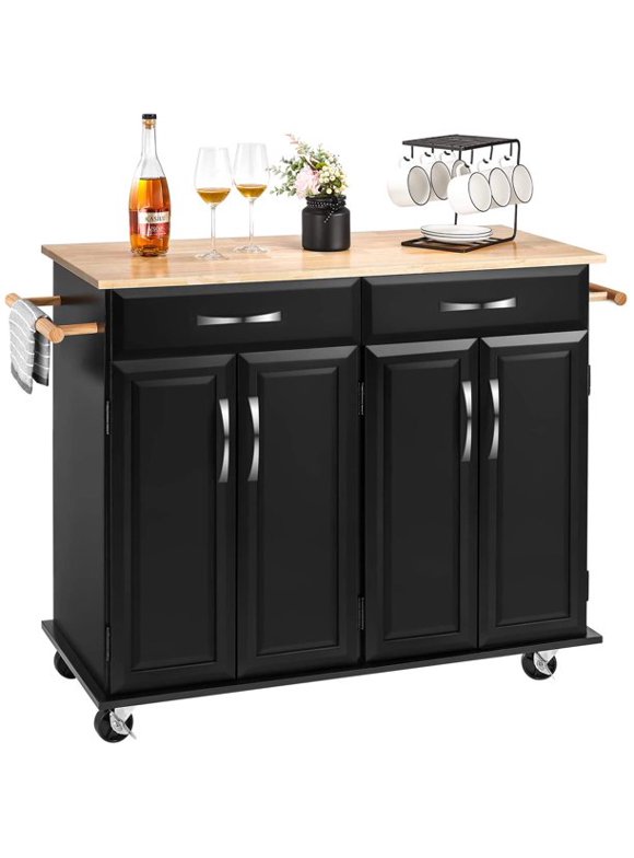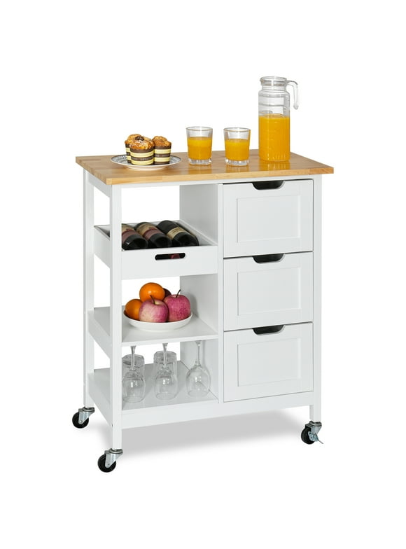 AVAWING Kitchen Island on Wheels, Rolling Kitchen Island Kitchen Cart Kitchen Island with Drop Leaf Rubber Wood Tabletop, 3 Drawers, Lockable Wheels, ...