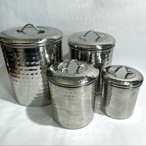 4 Piece Hammered Stainless Steel Canister Set with Fresh Seal?? Lids ... With their hammered Finish and generous storage capacity, these Stainless Steel canisters are the perfect countertop storage solution. Fresh Seal?? cover technology keeps stored items fresh and safe. Tarnish-resistant. 1 Qt., 1? Qt., 2 Qt. & 4 Qt. capacities.