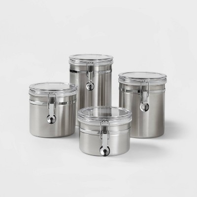 4 Piece Stainless Steel Canister Set - Walmart.com 4 Piece Stainless Steel Canister Set. USD $48.20 (4.5) 4.5 stars out of 23 reviews 23 reviews. ... 4-Piece canister set provides storage space for various foods. Made from durable stainless steel construction with a clear top flip-lid. Airtight design keeps ingredients fresh; includes four assorted sizes. ...
