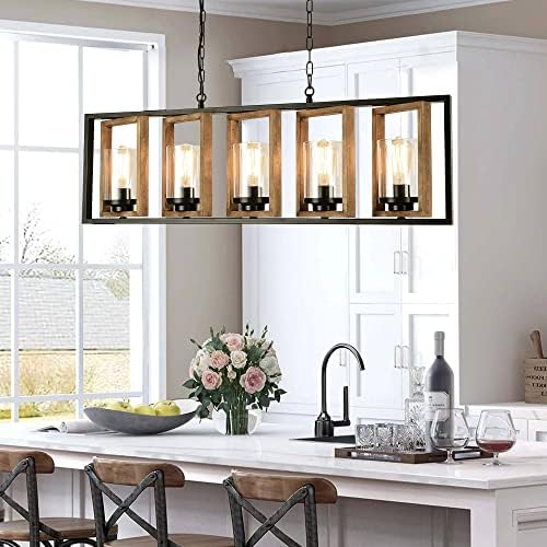 PAUFUL Farmhouse Kitchen Island Light Fixtures, Rustic Dining Room Light Fixture with Rotatable Wooden Frame, 5-Light Hanging Light Fixture with Glass ...