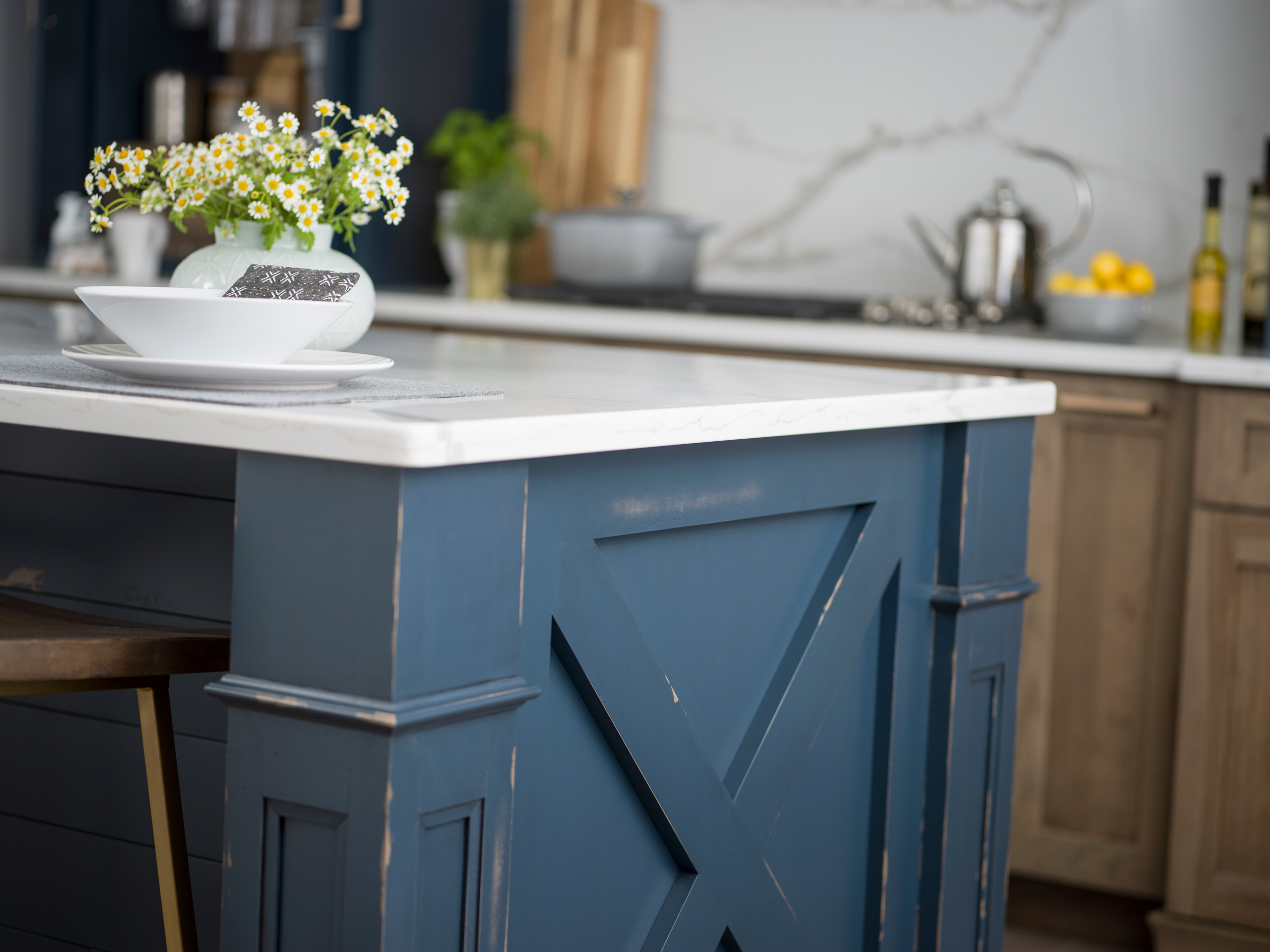 19 Rustic Kitchen Island Ideas for a Timeless Farmhouse Look A rustic farmhouse kitchen island sits under reclaimed metal bucket pendant lighting. White shiplap walls surround the room which also contains blue cabinets with a wooden countertop and white shiplap stove hood. Rustic décor and baking accessories sit on open shelving.