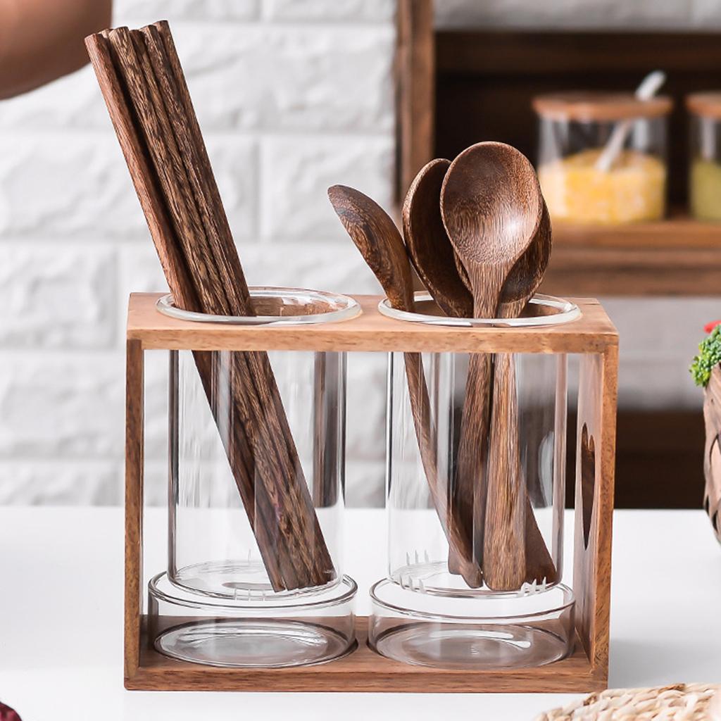 Kitchen Utensil Holder Chopsticks Storage Rack Glass Utensil Organizer Wooden Rack for Countertop Forks,Knives,Spoons