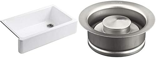 KOHLER Whitehaven Farmhouse Sink, Self-Trimming Tall Apron Front, K-6489-0, White & K-11352-BS Disposal Flange, One Size, Brushed Stainless