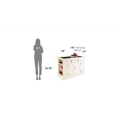 Nantucket White Kitchen Island by Home Styles Island extends to 48-inch width by 37-inch depth by 36-1/4-inch height with breakfast bar extended. Easy to assemble. Measures 48-inch width by 27-inch depth by 36-1/4-inch height. Nantucket kitchen island is constructed of hardwood solids and engineered woods in a sanded, distressed white finish providing an aged worn look.